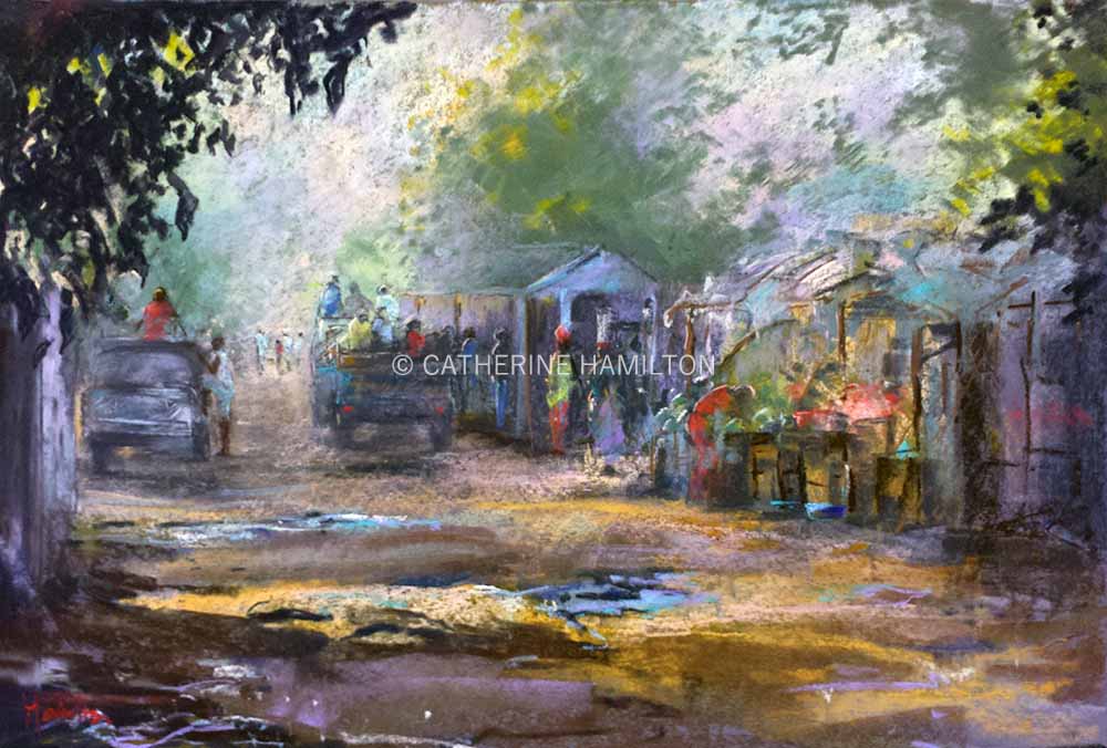 Early Morning Walk in the Village Zambia | 850mm x 750mm Framed | Pastel on Paper